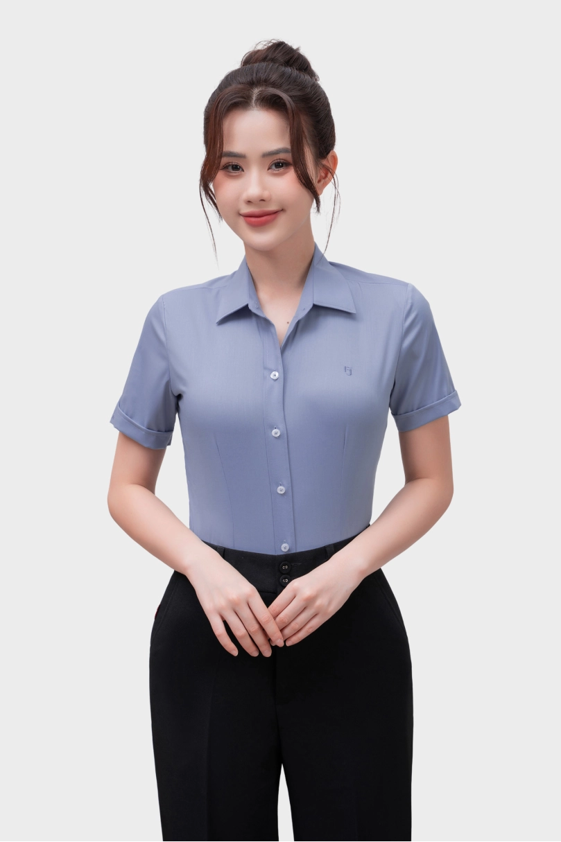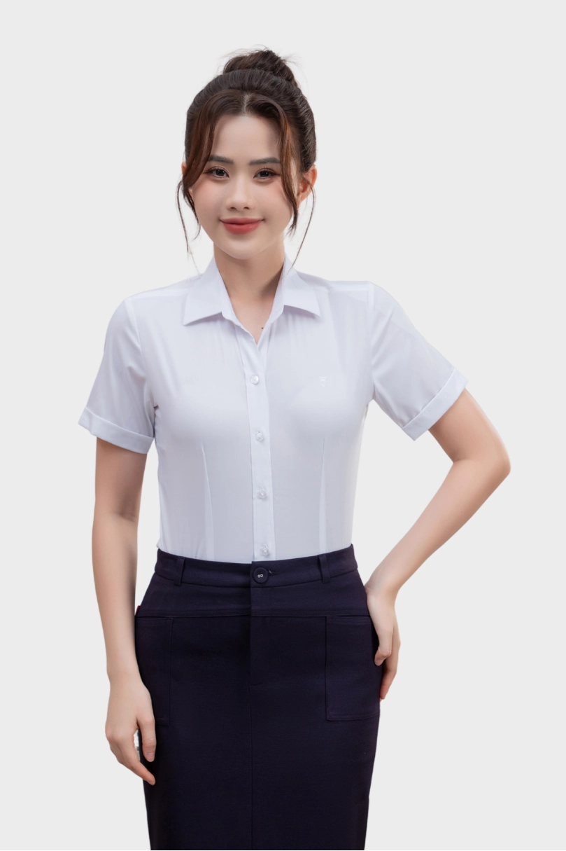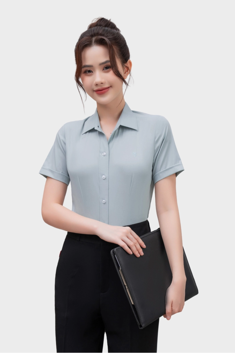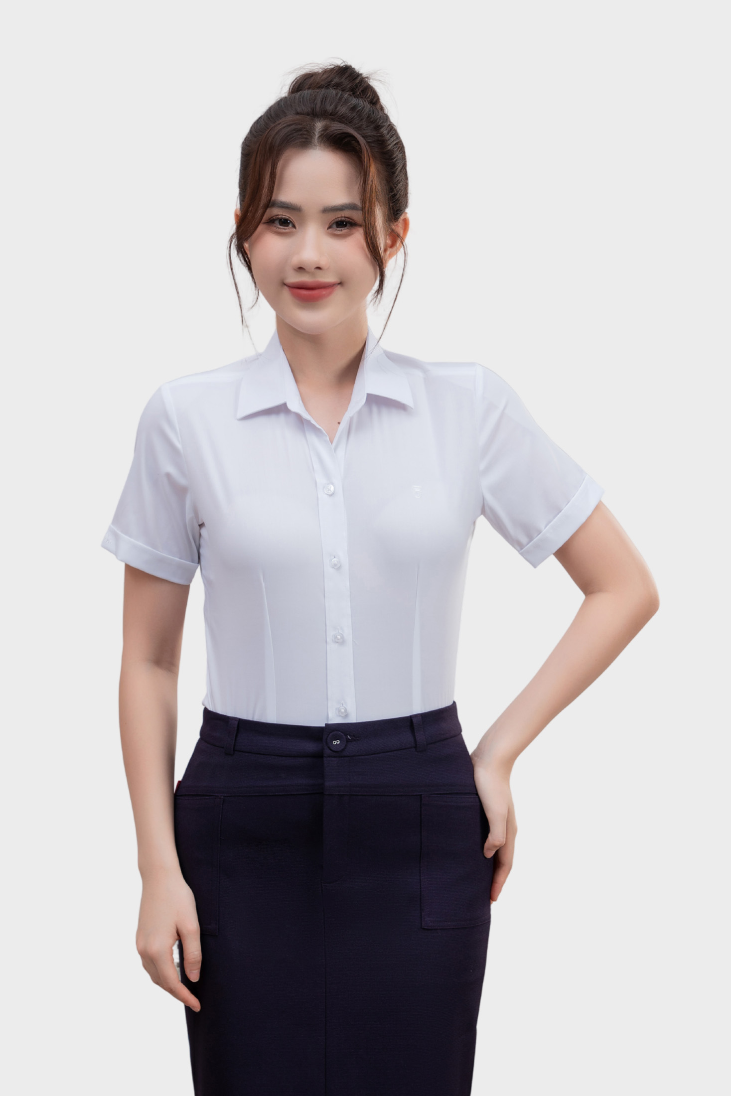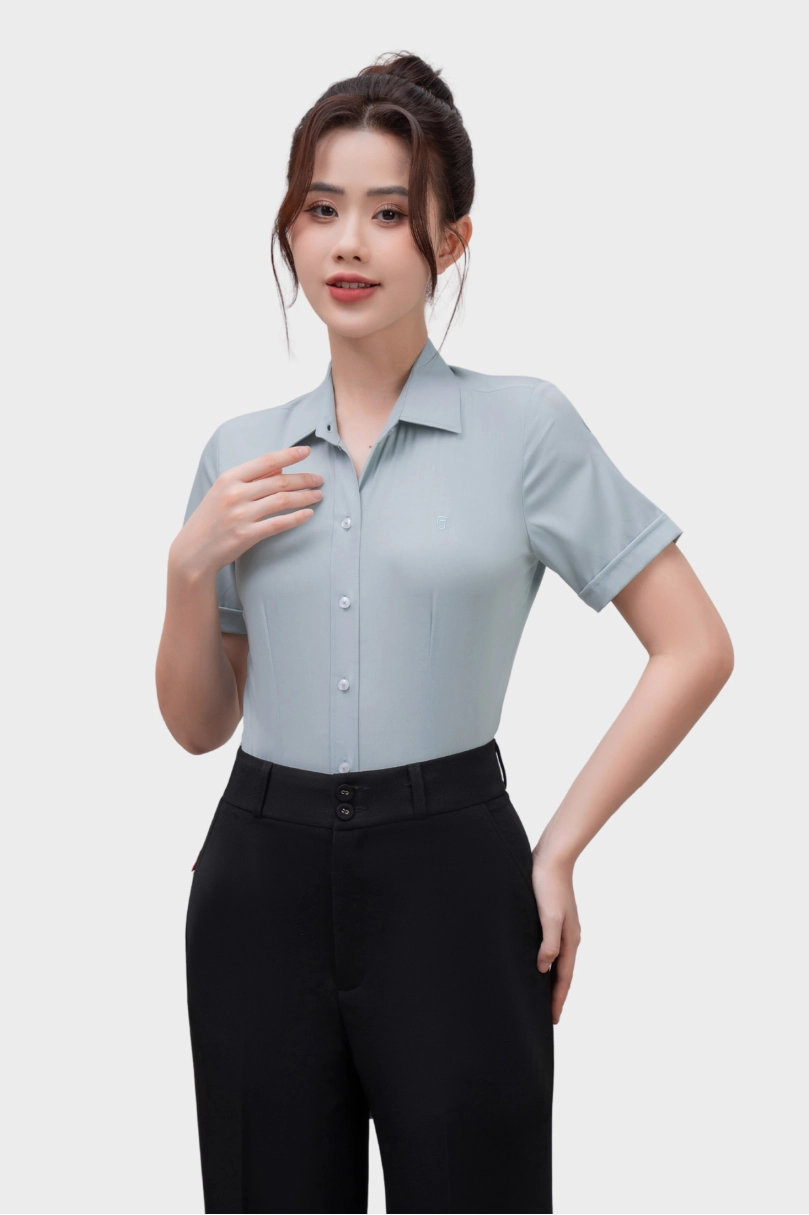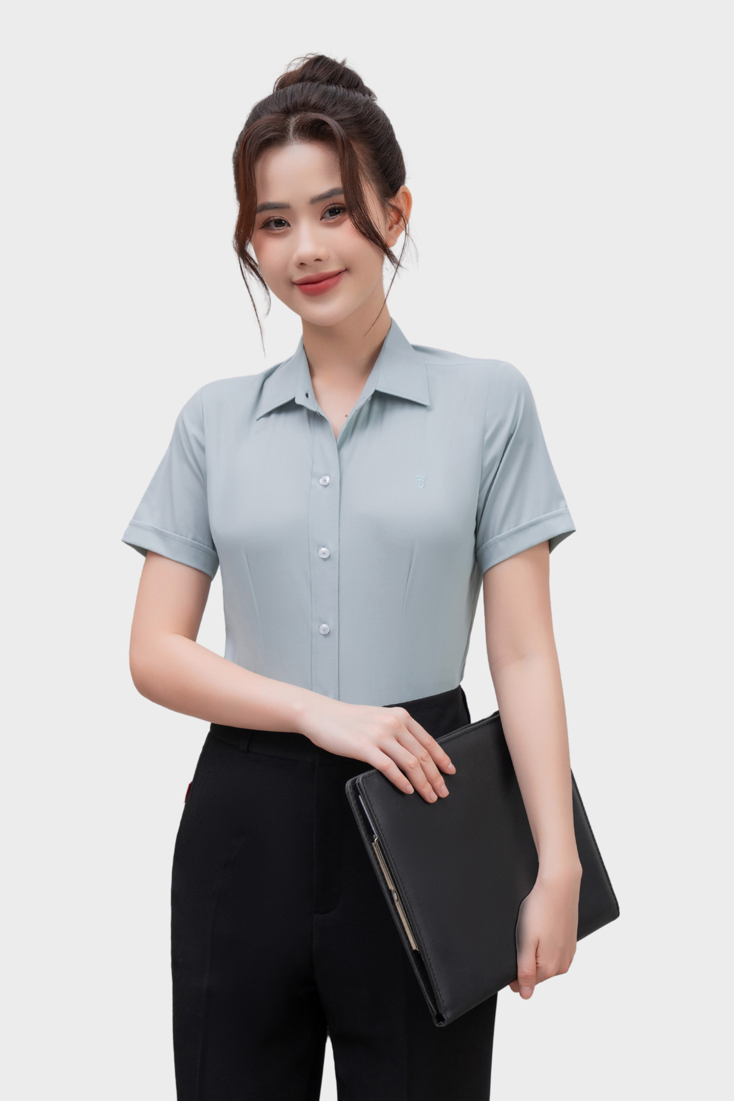 Áo sơ mi nữ ngắn tay Thái Hòa 25ASW-267 vải Bamboo Cotton cao cấp bản nẹp khuy có chiết eo cao cấp
