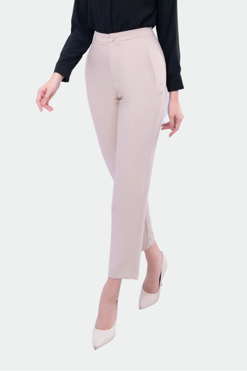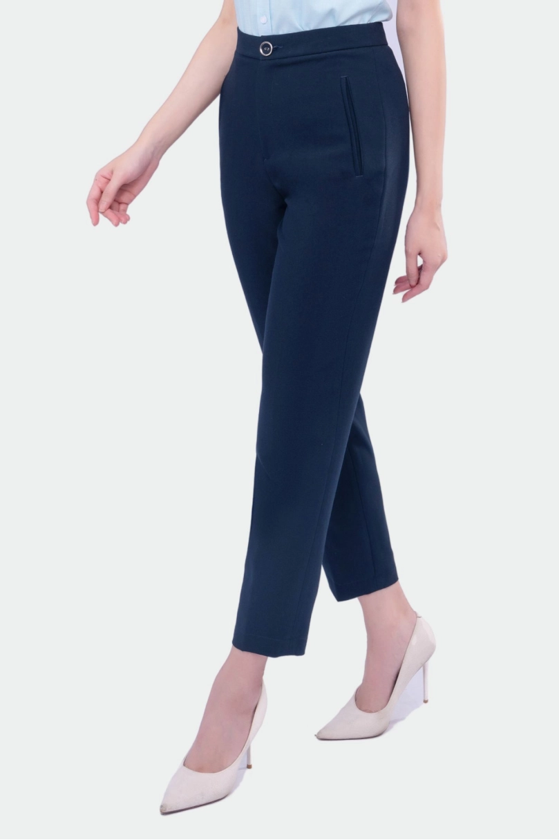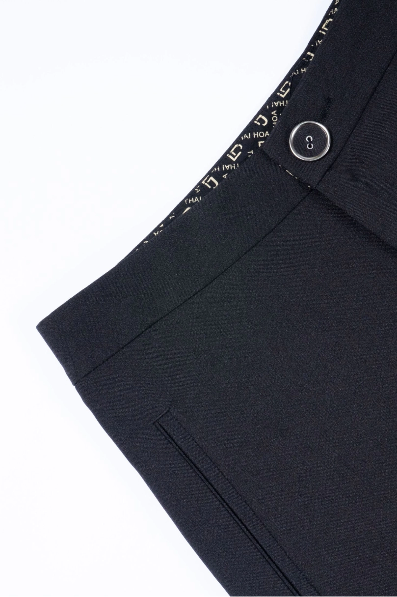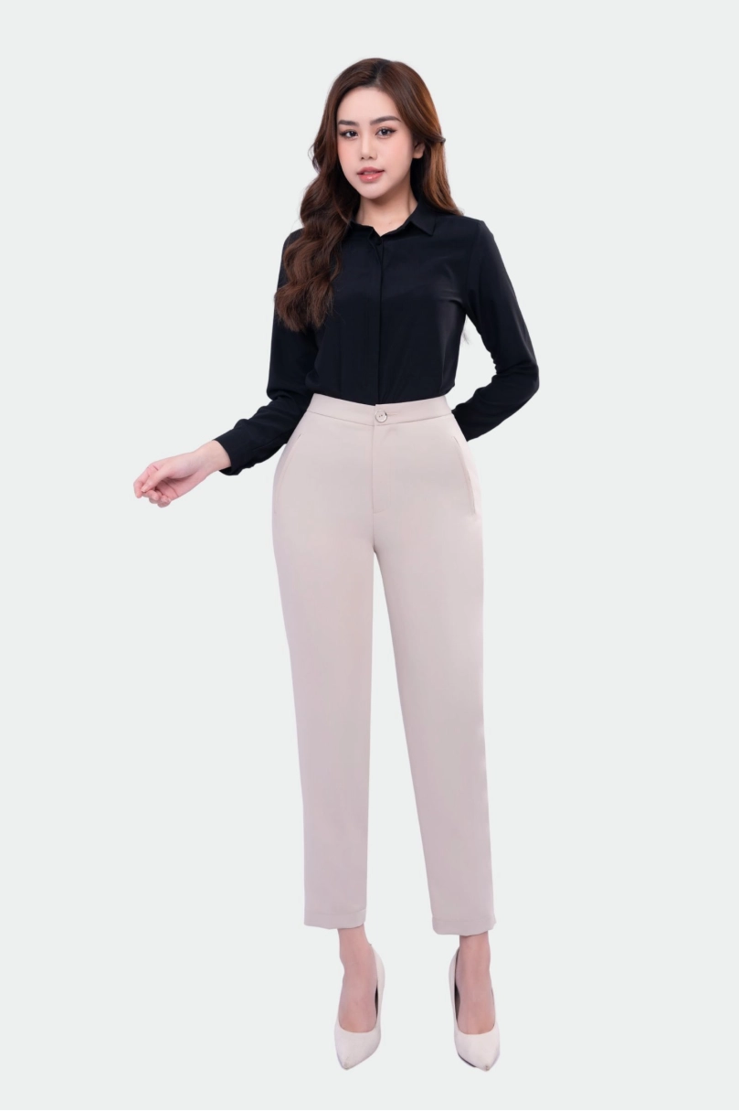 - Thiết kế tinh tế: Cúc bọc tiệp màu, form quần thon nhỏ dần xuống mắt cá chân giúp đôi chân trông dài và thon hơn.